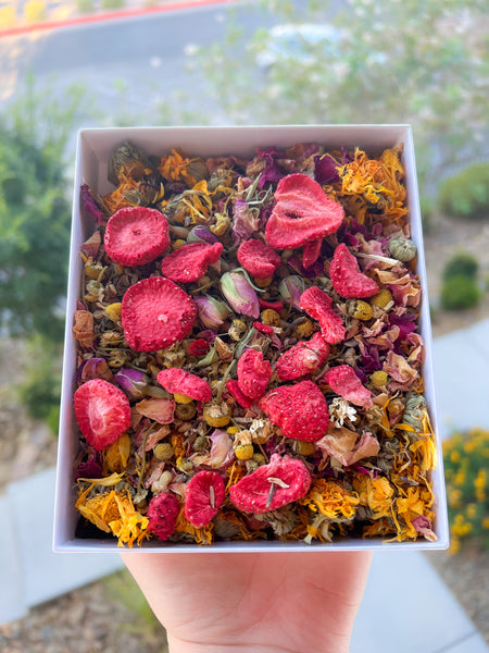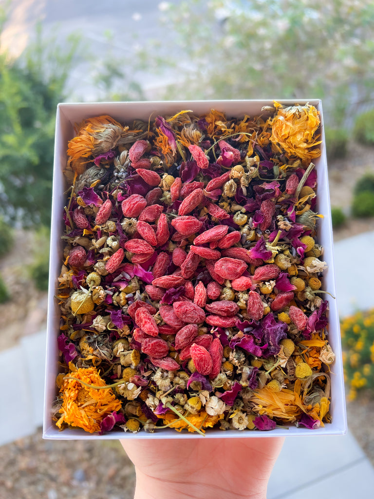 (100% Organic ingredients) Calendula Flowers, Chamomile Flowers, Hibiscus Flowers, Lemon Balm Leaf, Rose Petals, Lavender, and Goji Berries