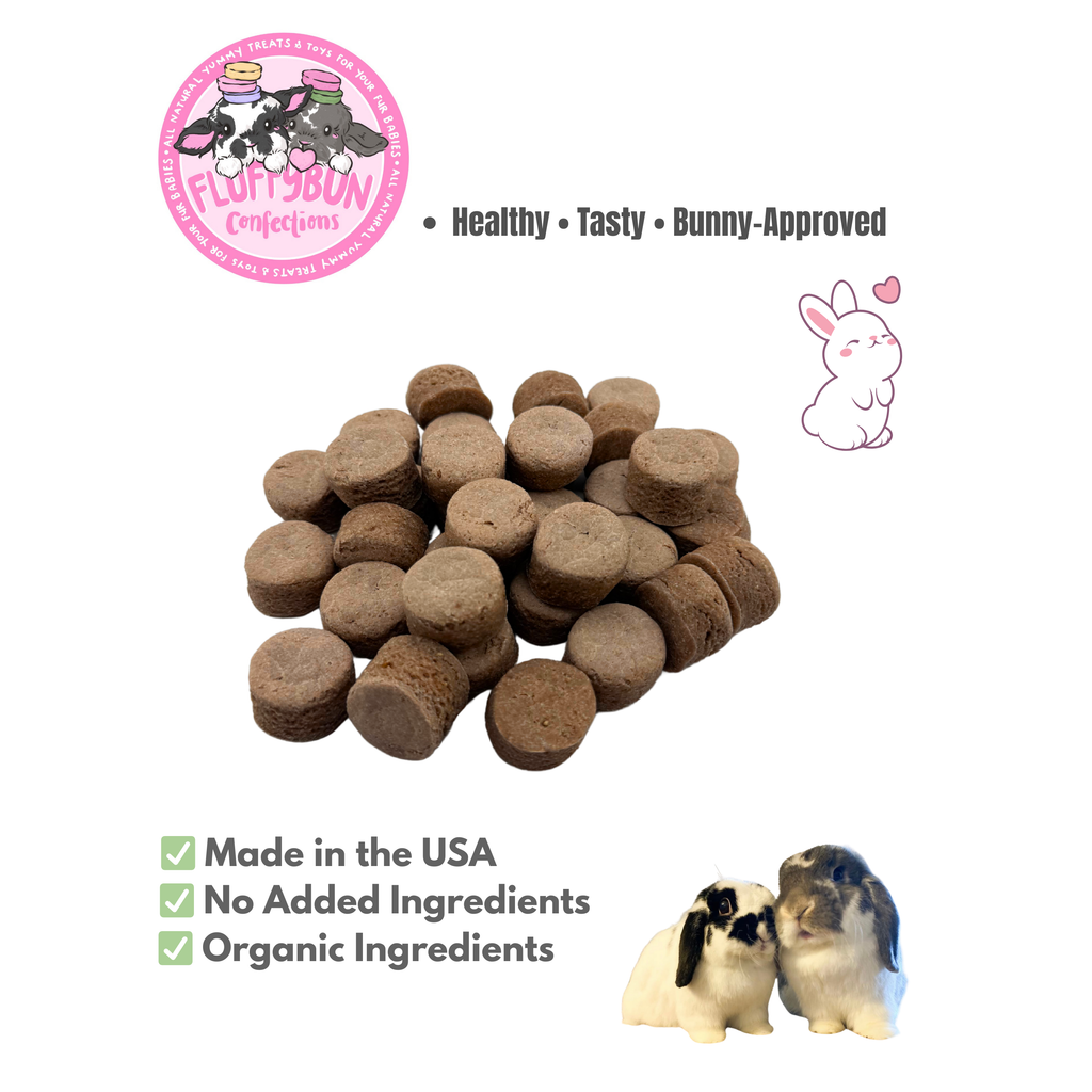 A hand made organic bunny treat, rabbit treat, guinea pig treat, small pet treat- that will make your fur babies binky with joy! All of our treats are baked in small batches and slowly dehydrated to ensure quality and freshness. All of our treats are made with as little as 2-3 ingredients including organic oat flour + fruit and veggies.