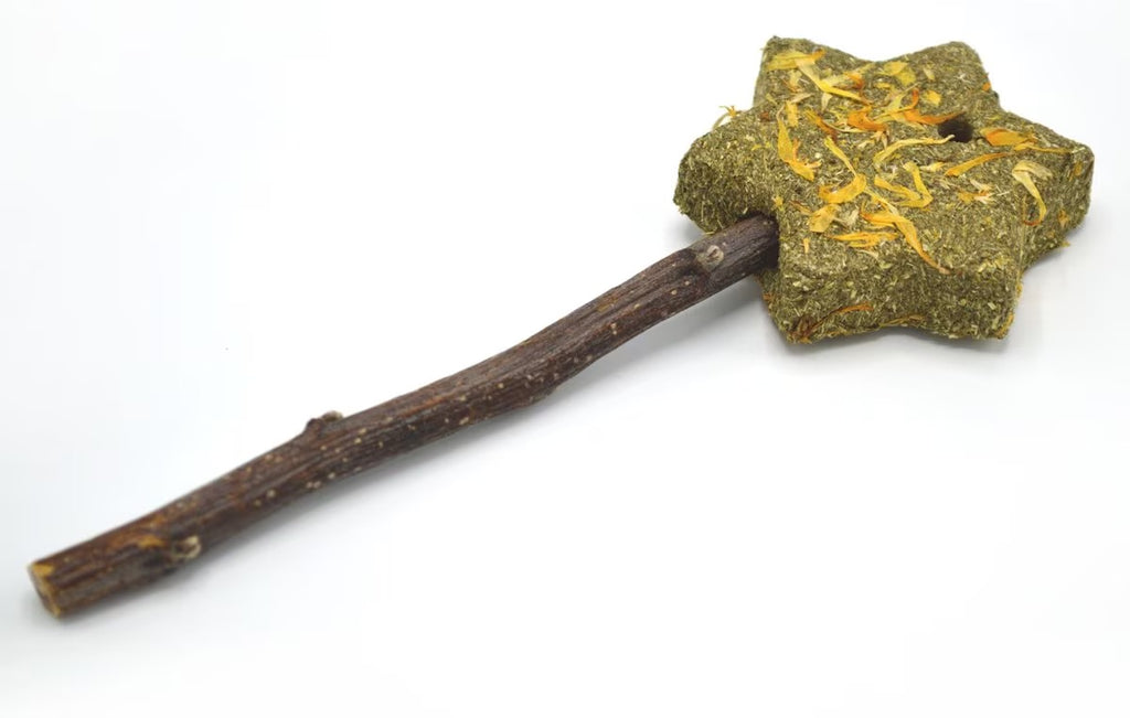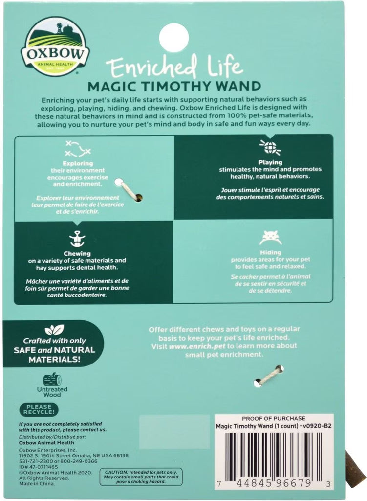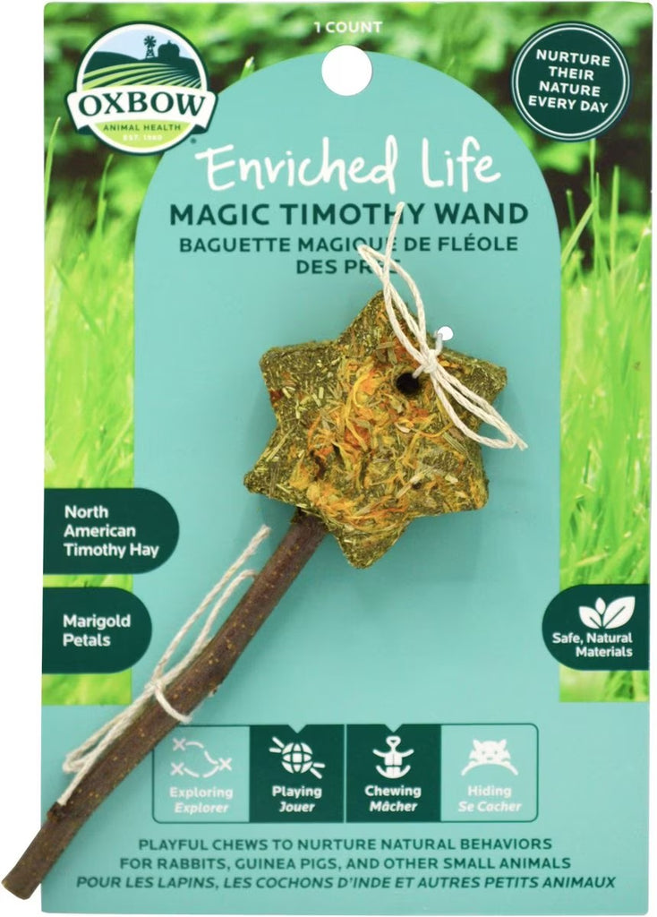 Endow your mini mate with magical powers using the Oxbow Enriched Life Magic Timothy Wand Small Animal Toy. This guinea pig and rabbit chew toy features a fun design that encourages mental and physical enrichment in your favorite furry friend. It is the paw-fect way to help strengthen the bond that you have with your animal amigo while encouraging his natural instincts to chew and play. This small pet chew toy is crafted using high-fiber timothy hay and enticing marigold petals that are 100% pet-safe for the health and happiness of your cutesy companion.